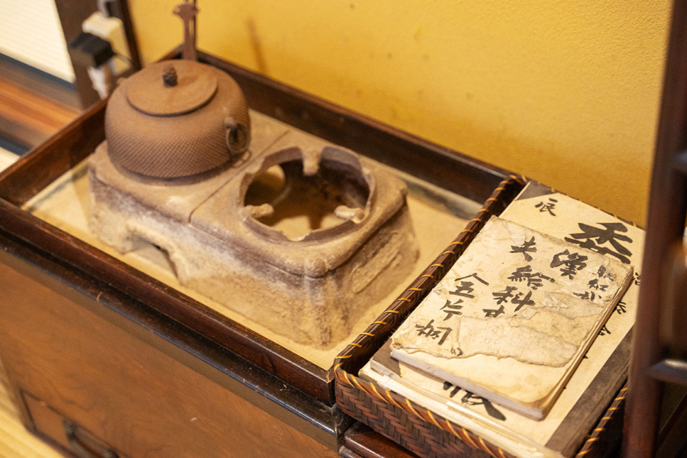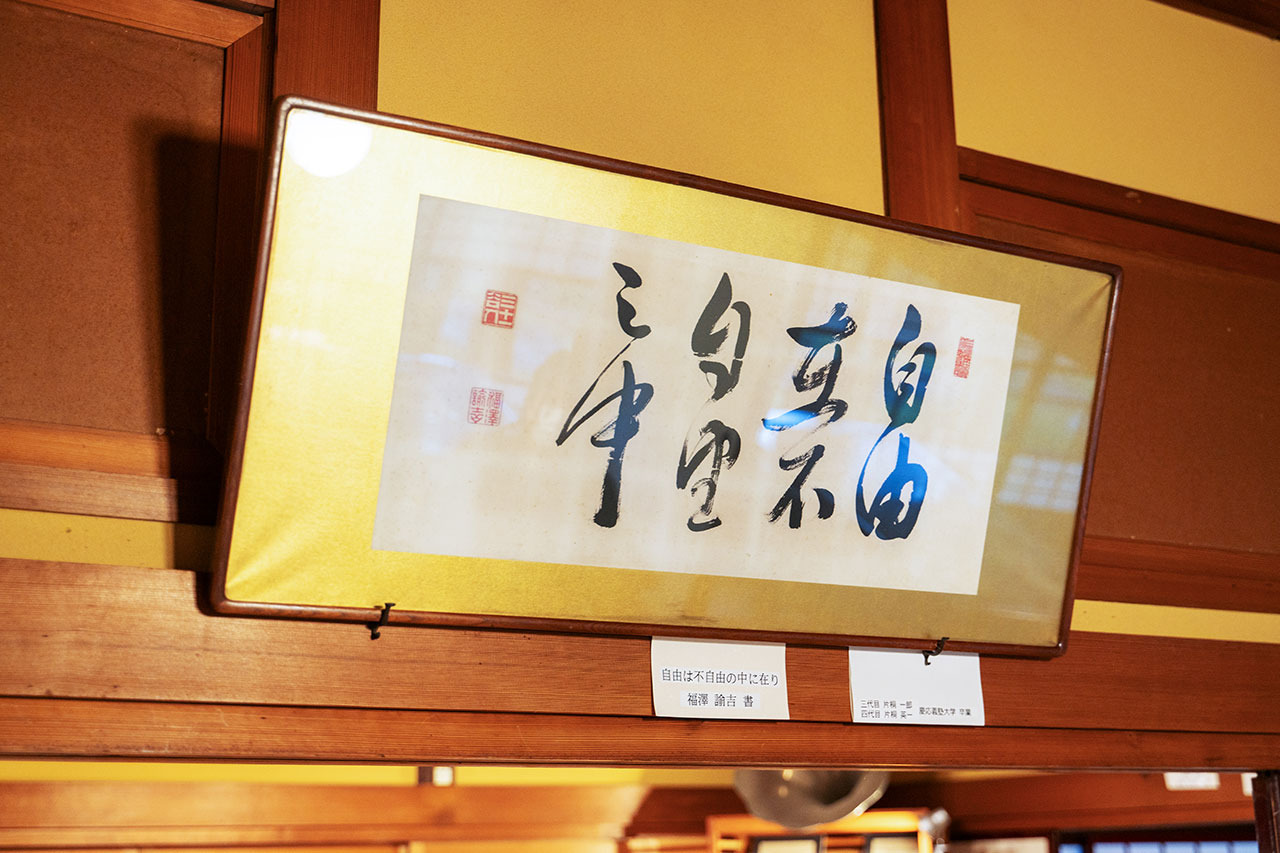 所蔵されている書や絵画、当時使われていた家具が飾られていたり、テーブルの天板にはかつて邸で使われていた襖が使われているそう。