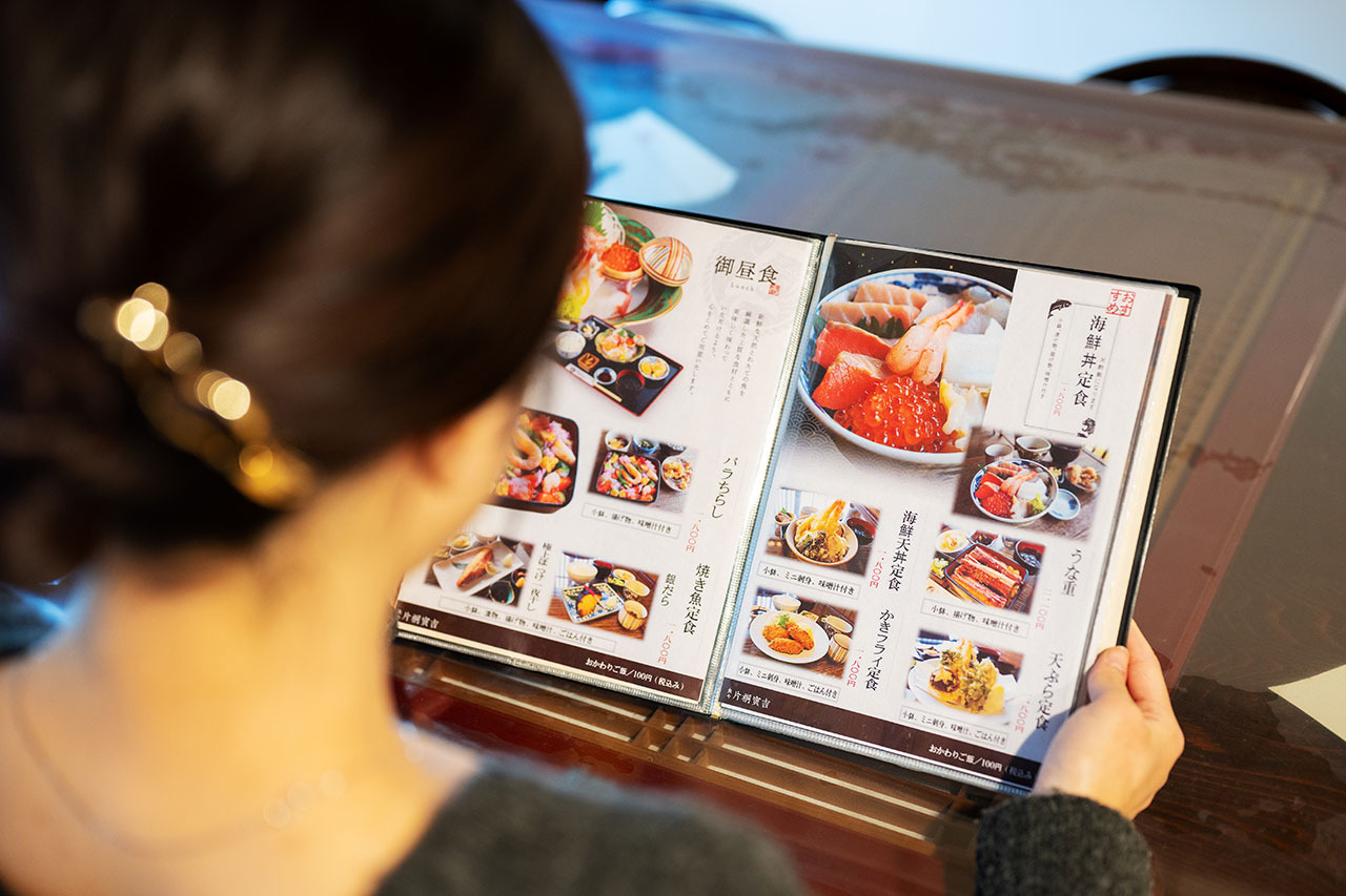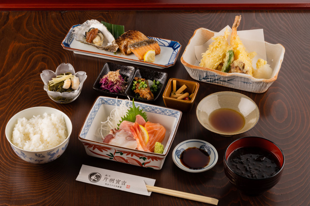 片桐寅吉では寿司や刺身定食、焼き魚など海鮮料理をリーズナブルにいただけます。