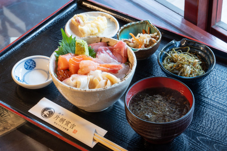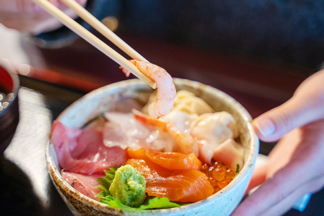 丼の中にはごはんが見えないほどネタがぎっしり。この日のネタは新潟で揚がったタイと甘エビをはじめ新鮮なマグロ、いか、サーモン、いくら、ほっき貝。昆布ベースの自家製醤油をつけていただきます。