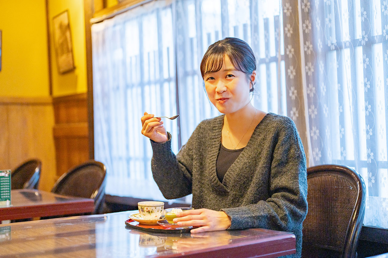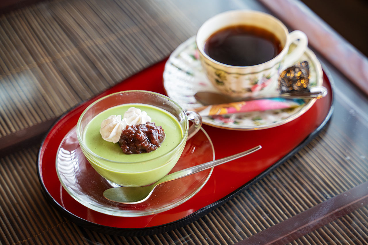矢部さんが食べているのはお店のおすすめで抹茶ババロアとコーヒー。新潟の雪室で熟成させた抹茶や豆を使っているためどちらもまろやかな味わいが特徴です。