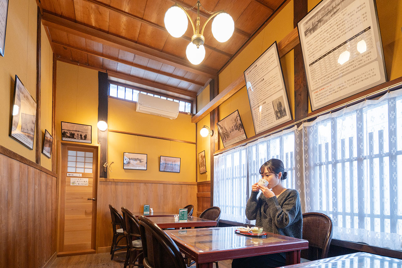 併設する港茶屋では、当時の雰囲気が残るレトロな洋室でお茶やスイーツを楽しめます。