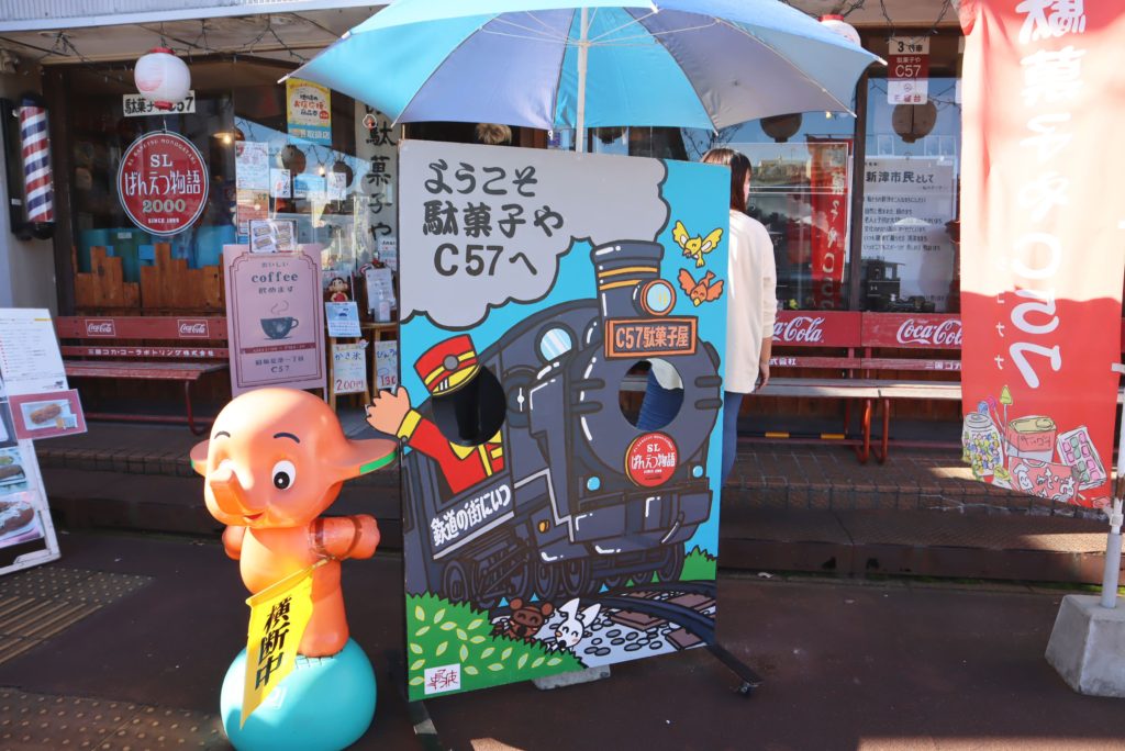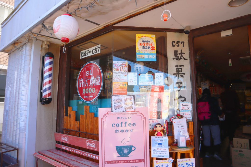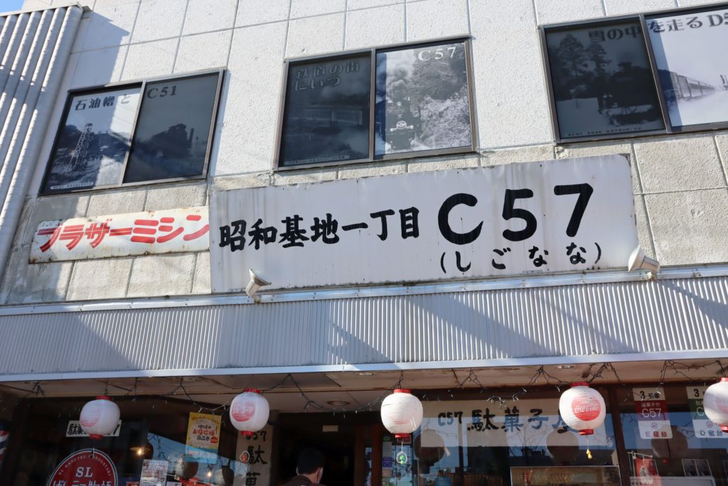 One of Niitsu’s most wellknown shops is “C57,” a retro-looking dagashi candy shop located a mere 3 minute walk from Niitsu Station. The name is said to come from the C57-180 train* that can be said to symbolize Niitsu, showing just how much the locals love their trains. Before heading in, let’s take a step back in time by taking a retrolooking picture in front of the shop.