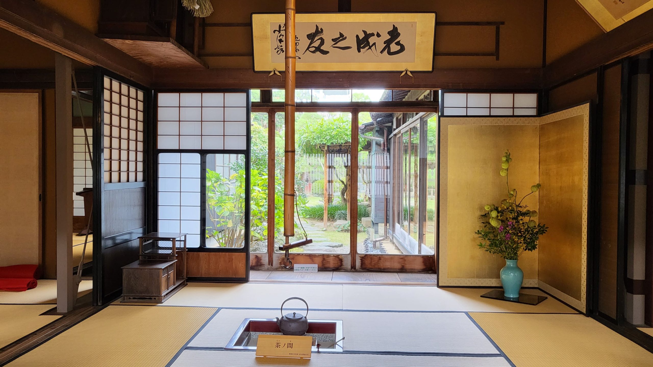 The reason why the hallway is so narrow is because at the time, real estate taxes were determined by the width of the passage. In order to lower their taxes, people would make their hallways narrower. To the right of the hallway are the tatami rooms for special occasions (zashiki), the sitting room (cha no ma), and the antechamber (tsugi no ma) which connects to the bedroom. I would like to draw your attention to the sitting room. Historically, the hearth (irori) in the center of the room was used to boil water and heat the room. On the opposite side of the sitting room’s entrance is a large window that faces the Japanese garden. The sitting room floor is covered wall to wall with tatami mats and it is easy to imagine how important guests were entertained or how tea ceremonies were held in this room. One wonders how it must have felt to rest while enjoying the scenery outside the window after a busy day.