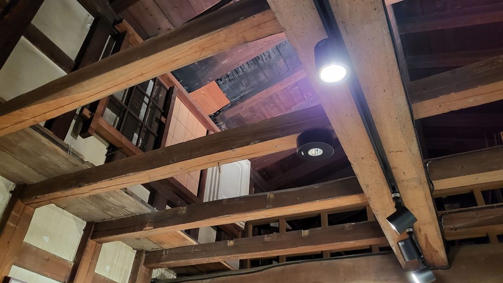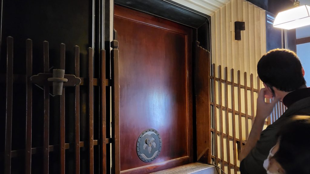 Going further into the residence, at the end of the hallway there is a tool storeroom with large, thick doors. As for why the doors are so thick, they were made to protect the goods inside of the storeroom in the event of a disaster. During the Edo and Meiji periods, most buildings in Japan were built with wood and as a result, fires were not uncommon. In the August of 1880, there was a large fire in Niigata and like most of the homes of the townspeople, the Ozawa family’s residence also suffered great losses. Evidence of this can be seen next to the storeroom’s entrance, which still has burn marks. You can also see a burnt wooden beam that still remains inside one of tatami rooms.