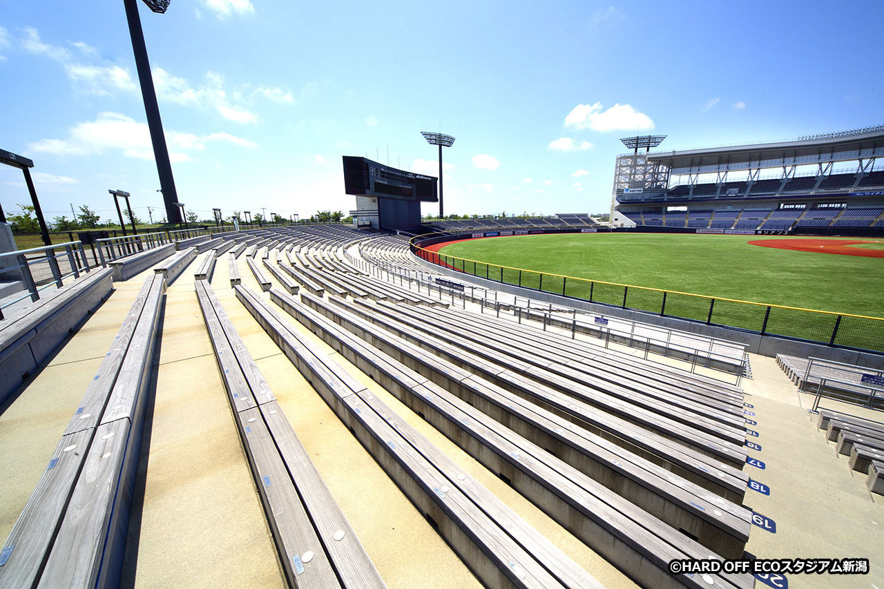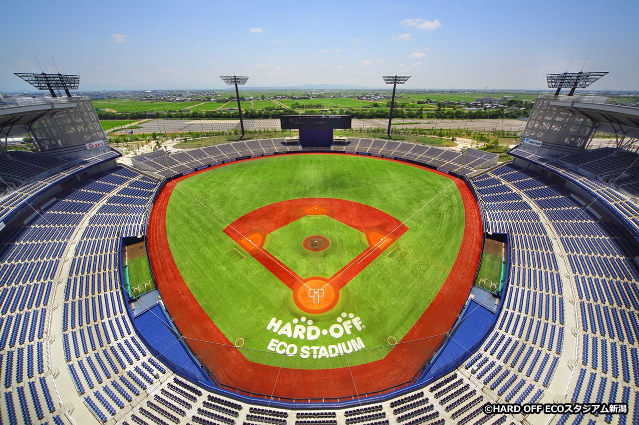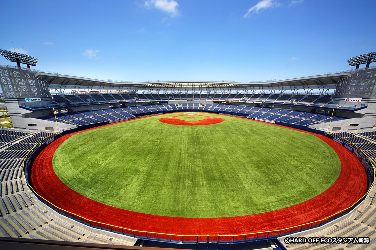 2009年完成の県内最大級約30,000人が収容可能な野球専用スタジアムです。フィールドは全面人工芝、1塁側と3塁側には約1,000㎡の屋内練習場が併設され、プロ野球やトップチームのゲームも開催可能な照明設備とスコアボード、大型映像装置も完備されています。オールスターゲームや国際大会なども開催され、また大型音楽イベントなども開催される新潟の新たなスポーツ拠点です。(バリアフリー対応)