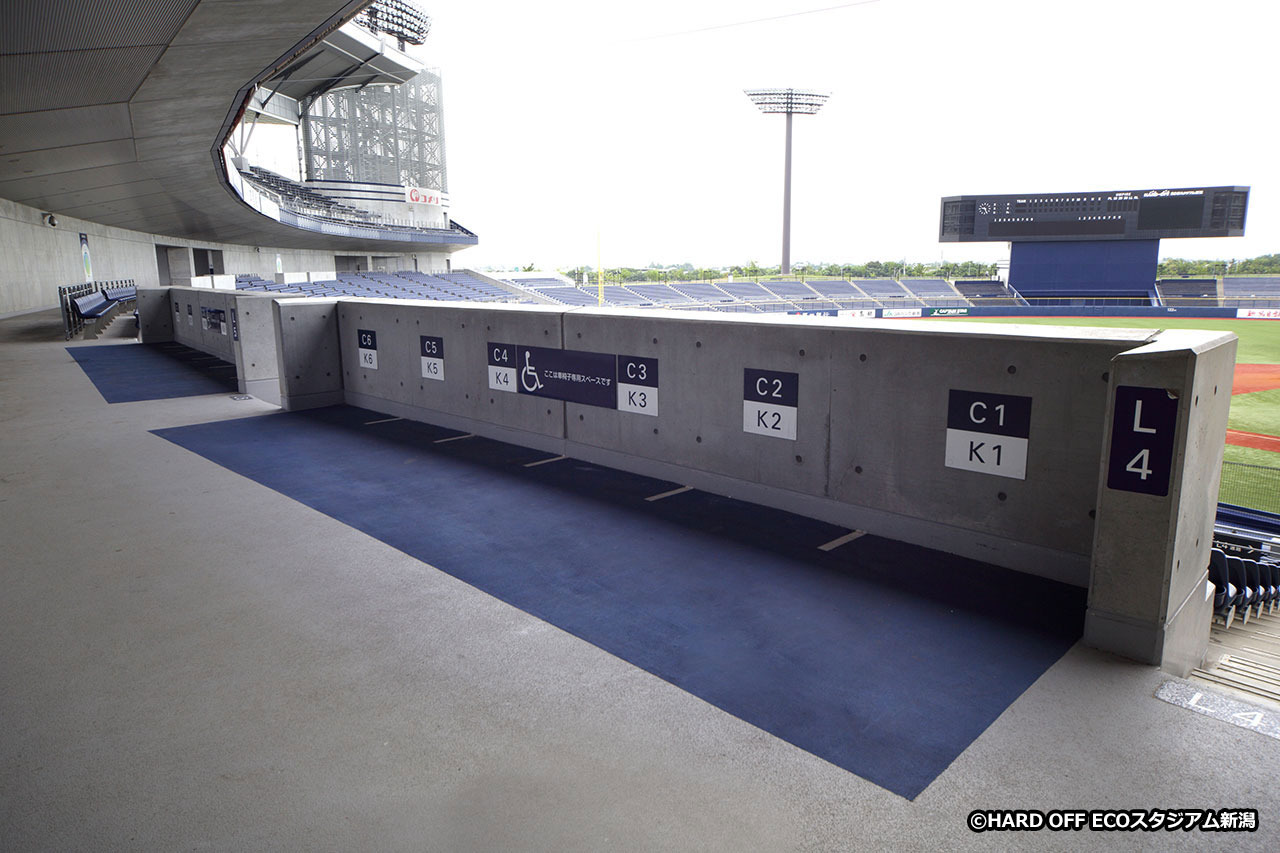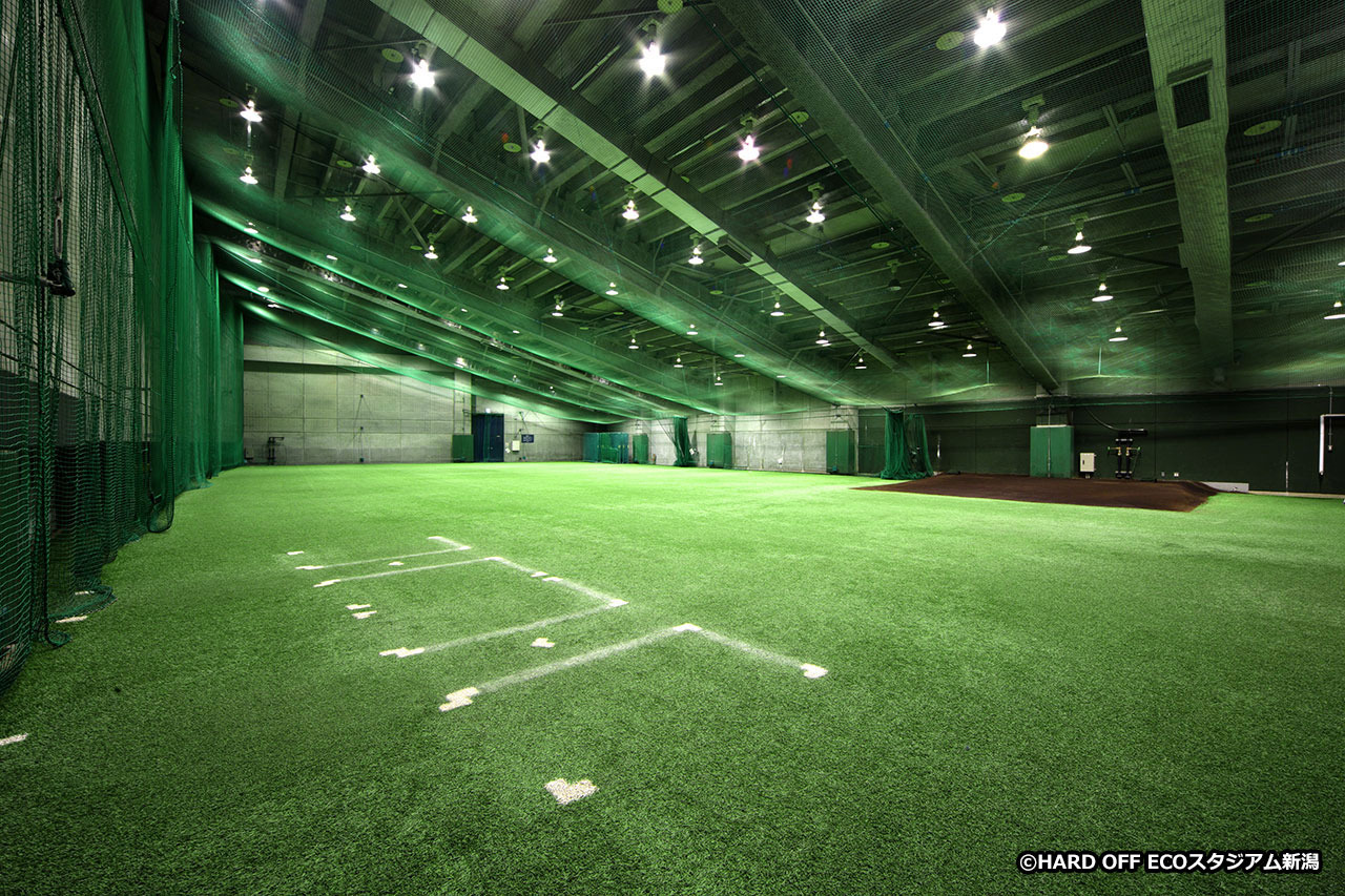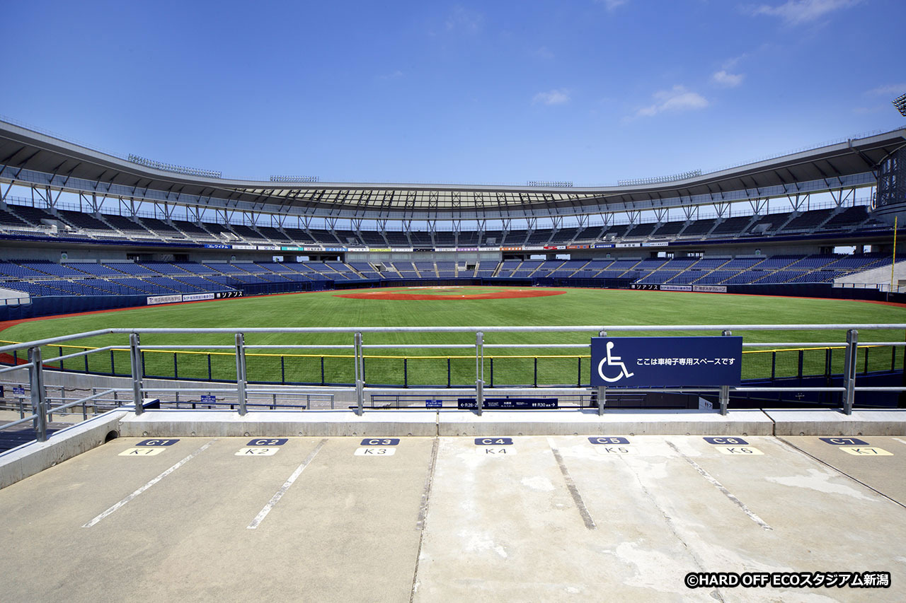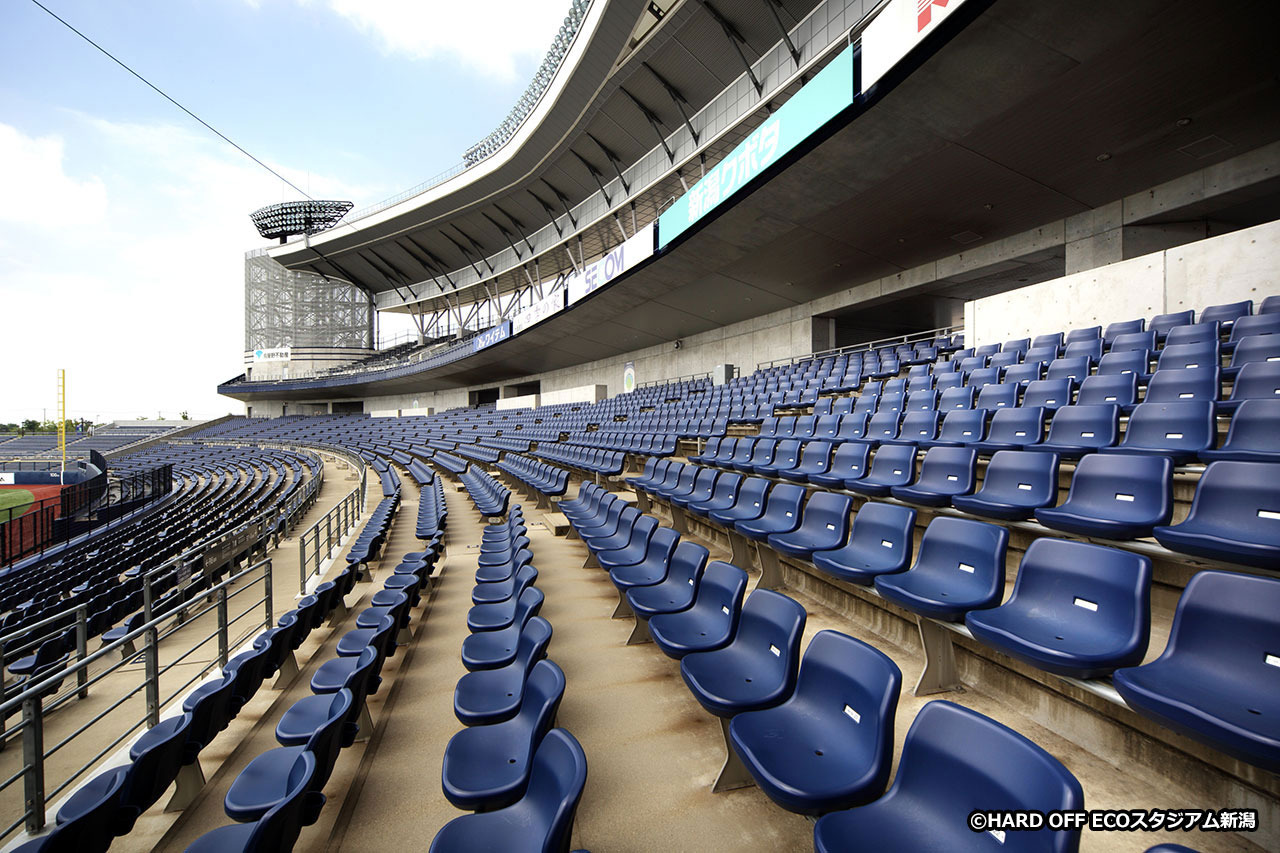 2009年完成の県内最大級約30,000人が収容可能な野球専用スタジアムです。フィールドは全面人工芝、1塁側と3塁側には約1,000㎡の屋内練習場が併設され、プロ野球やトップチームのゲームも開催可能な照明設備とスコアボード、大型映像装置も完備されています。オールスターゲームや国際大会なども開催され、また大型音楽イベントなども開催される新潟の新たなスポーツ拠点です。(バリアフリー対応)