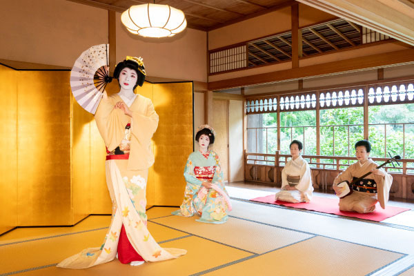 | 料金例 | 芸妓5人(踊り3人、唄1人、三味線1人) 15分~20分の踊りと、40分程度の歓談(合計1時間)で約100,000円~ ※人数や会場によって料金が異なります。詳細は下記までお問い合わせください。 |