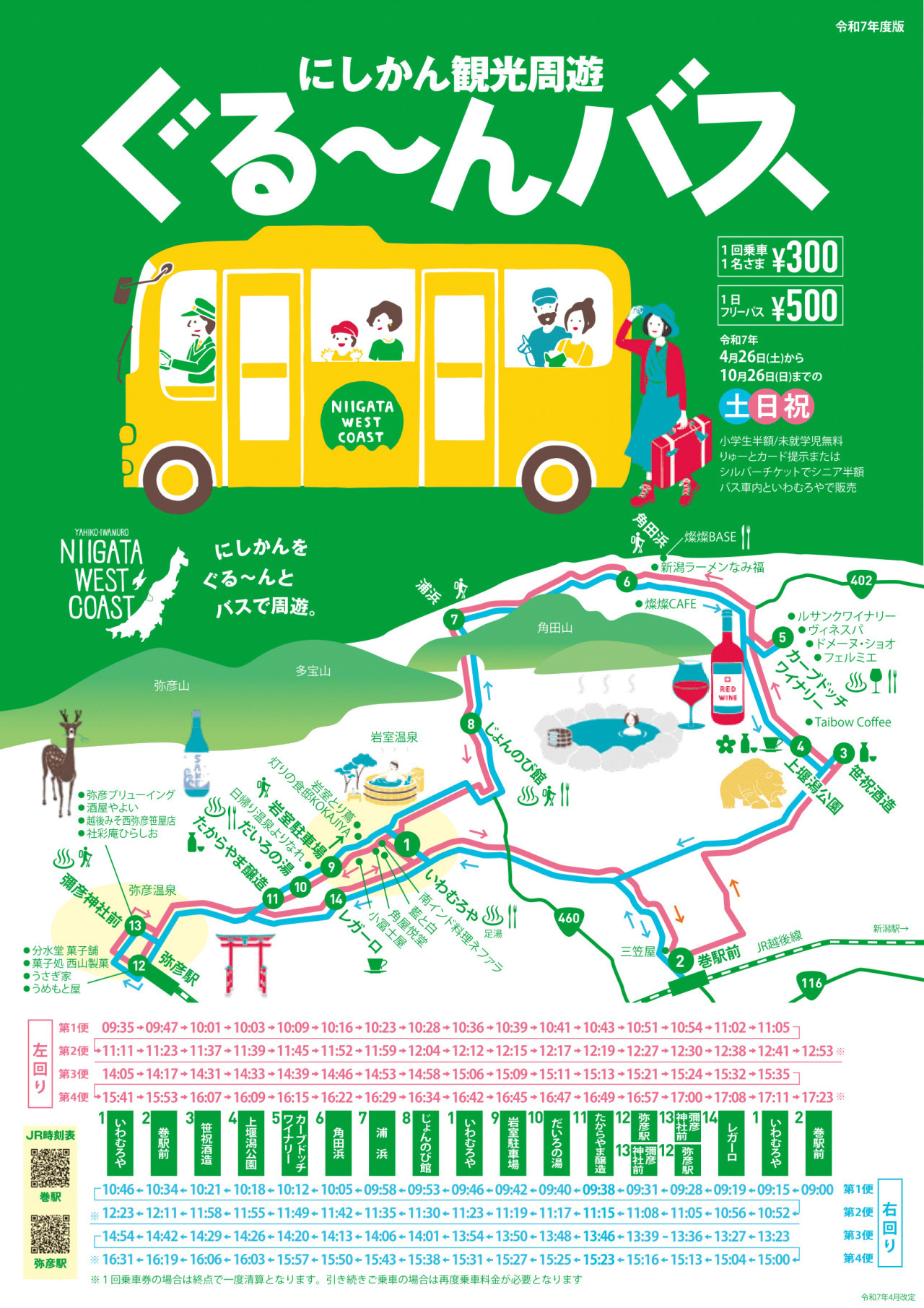 | 経由地 | 新潟市岩室観光施設いわむろや JR越後線 巻駅 笹祝酒造 上堰潟公園 カーブドッチ・ワイナリー 角田浜 浦浜 福寿温泉 じょんのび館 岩室駐車場 多宝温泉 だいろの湯 たからやま醸造 JR弥彦線 弥彦駅 弥彦神社 ジェラテリア・レガーロ |