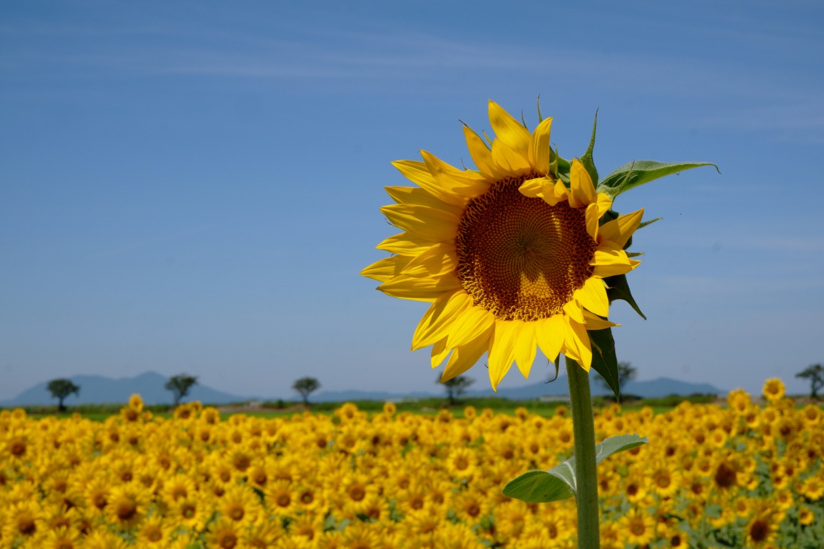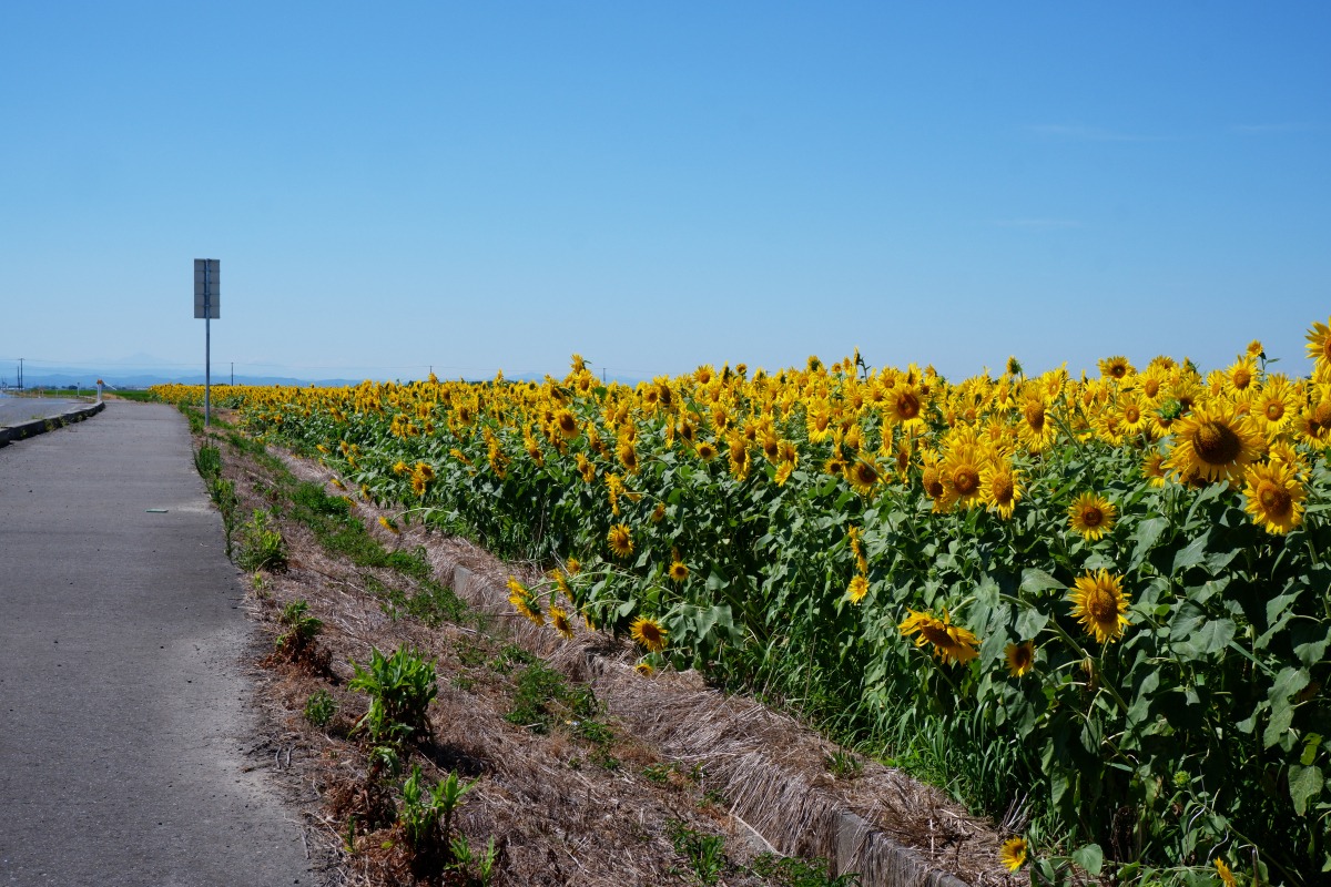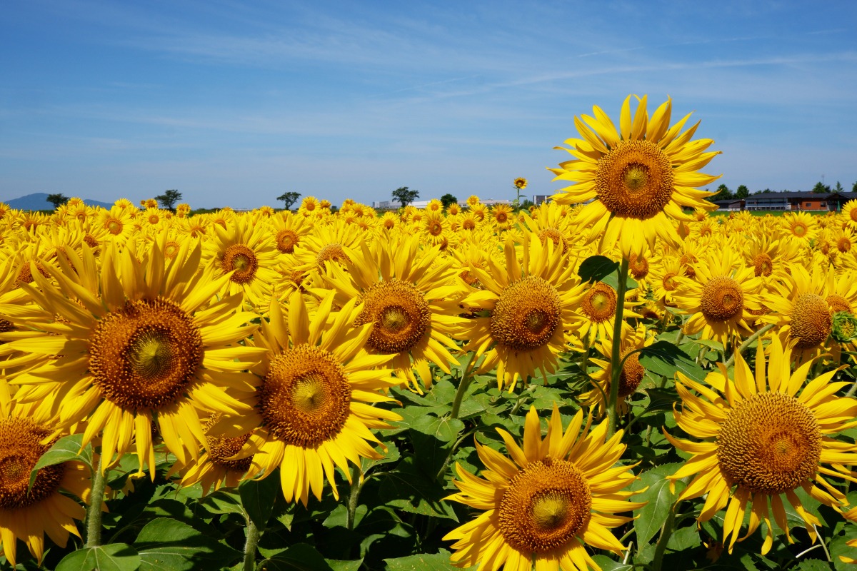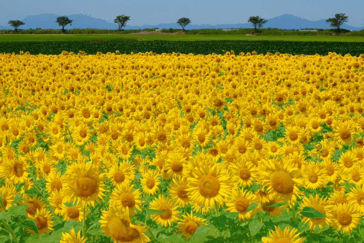 新潟市南区の「新潟市アグリパーク」裏手には、約300坪のひまわり畑が広がります。可愛らしい小ぶりのひまわりが一面に咲き誇り、訪れる人々を明るい気持ちにさせてくれます。背景には弥彦山や角田山が連なり、越後平野ならではの開放的な風景も楽しめます。畑の周囲は田園風景に囲まれており、まるで絵本のようなひとときが味わえるスポット。アグリパークでの農業体験や直売所とあわせて、夏の思い出づくりにぜひ立ち寄ってみてください。