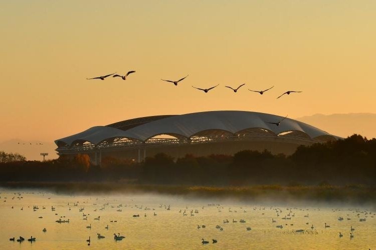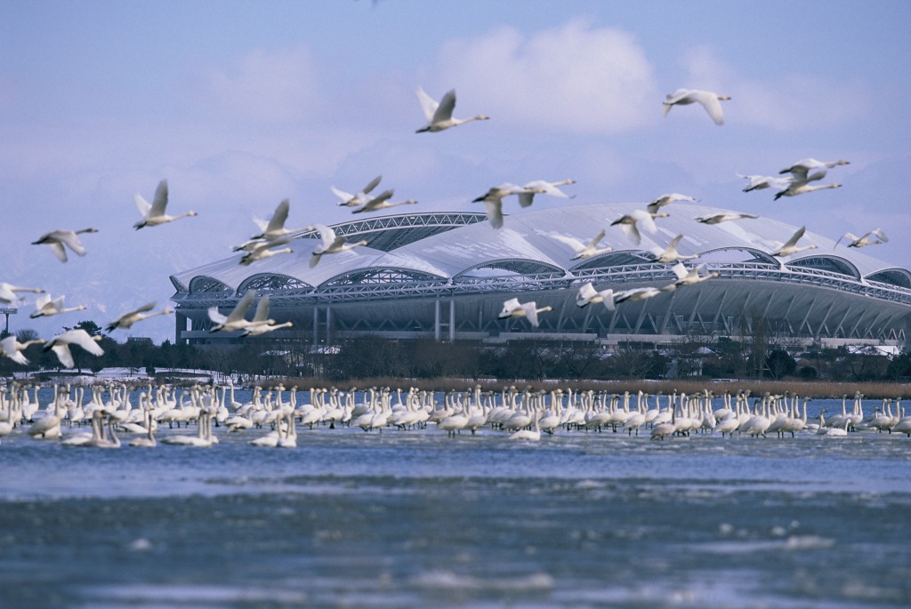 また、野鳥観察舎上の展望台からは、頭上すぐを羽ばたく白鳥の姿が見られるとともに、羽音も聞こえてきます。