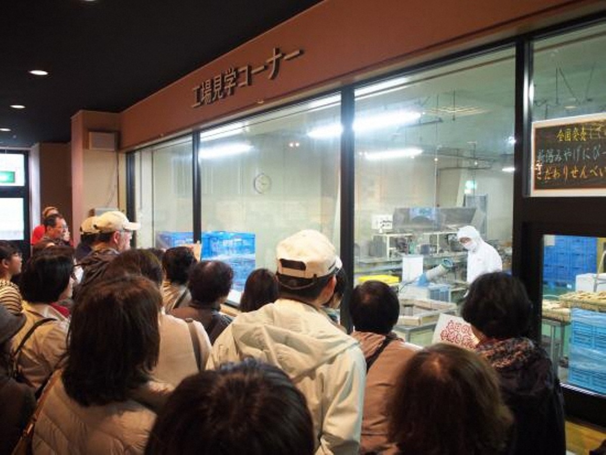 おせんべいの工場見学ができるだけでなく、自分で焼いたり、味わったりもできます。