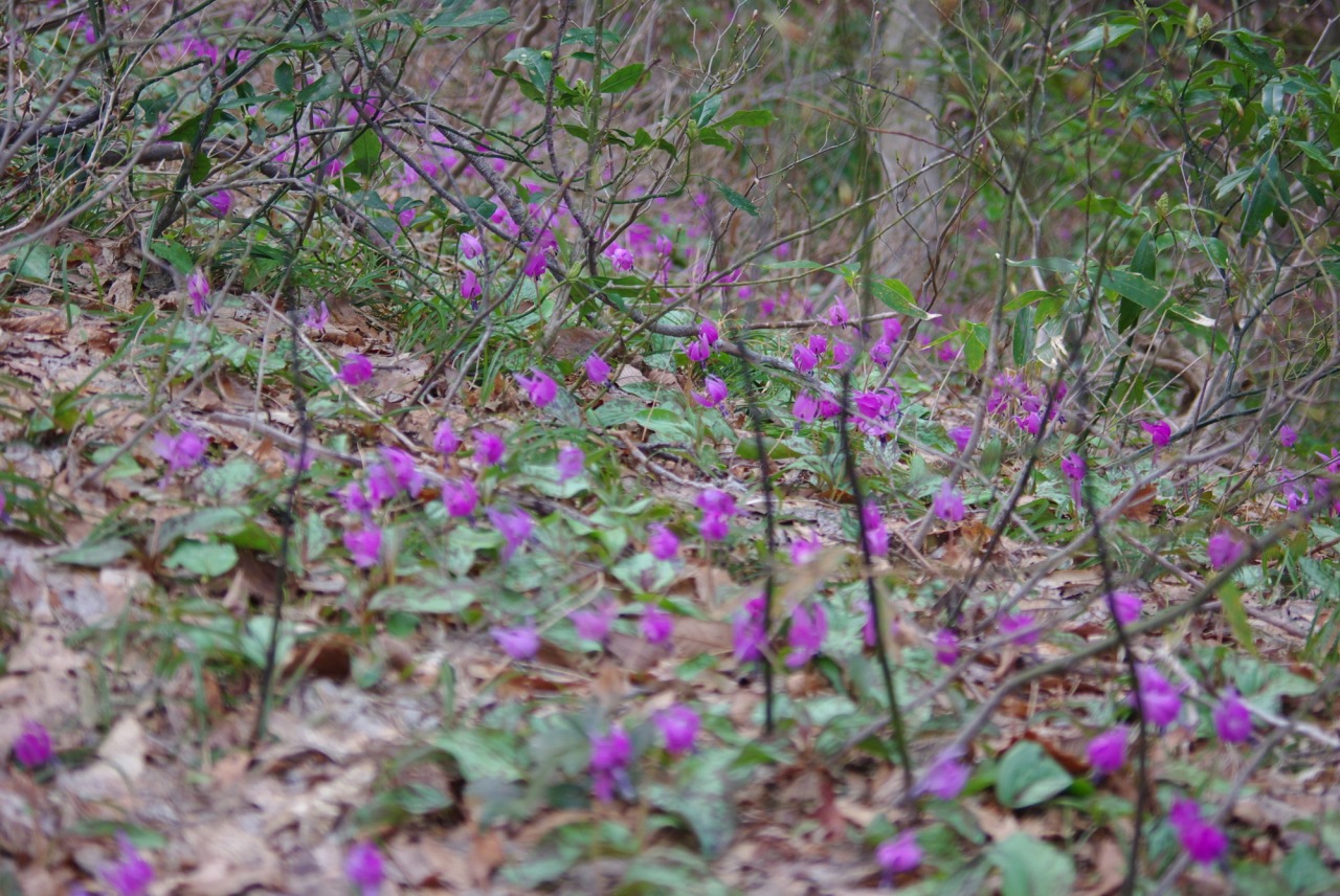 角田山が最も輝くのが春。「花の山」とも呼ばれるように、雪解けとともに雪割草が可憐な花を咲かせると、それに続いて次々と山野草が山を彩ります。斜面一面を埋め尽くすカタクリの群生も圧巻です。