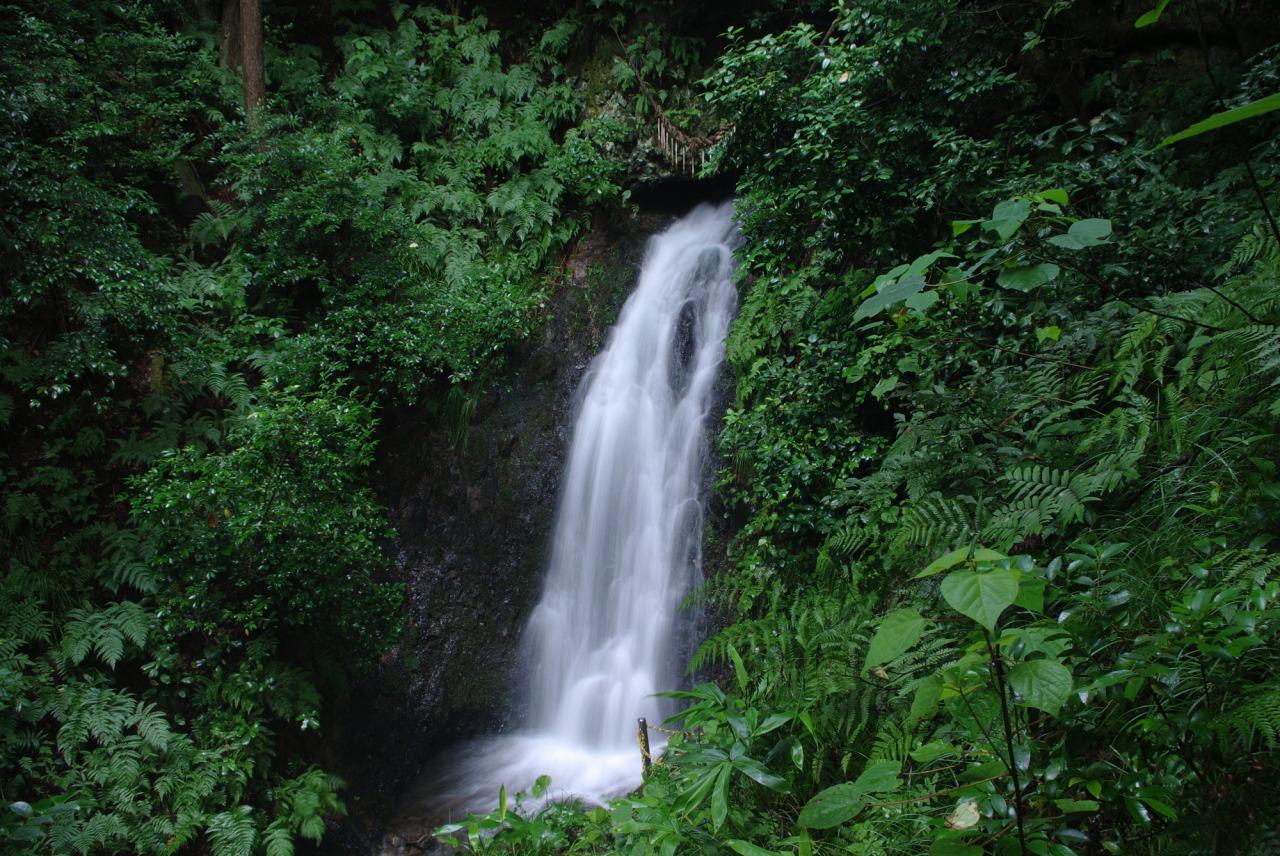 登山口には弘法清水、五りん滝があり、松・杉の壮大な植林地帯をぬけて山頂につく。