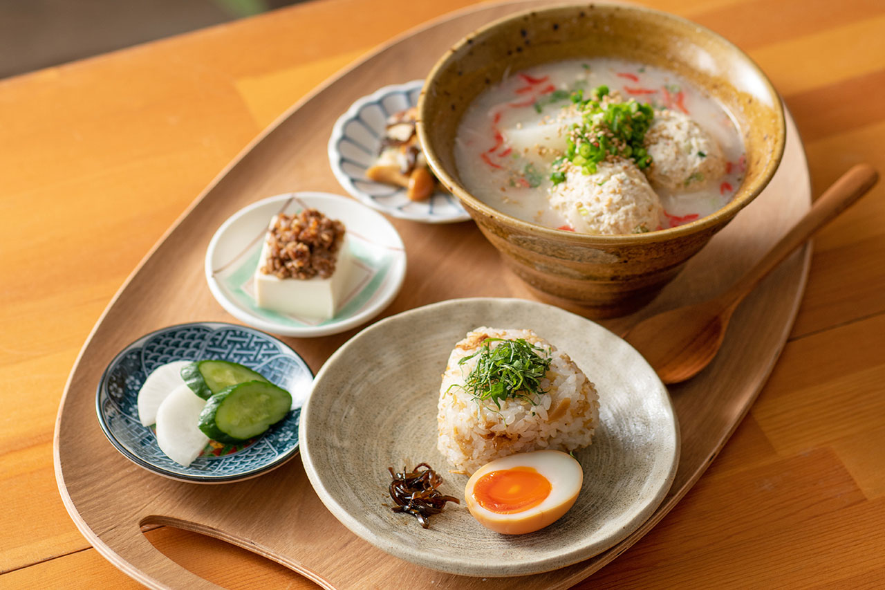農家の息子がつくる食堂「さんかくとまる」の、新潟県産のお米を使用したおむすびは子どもでも食べやすく、テイクアウトも可能。種類豊富な味を楽しめます。