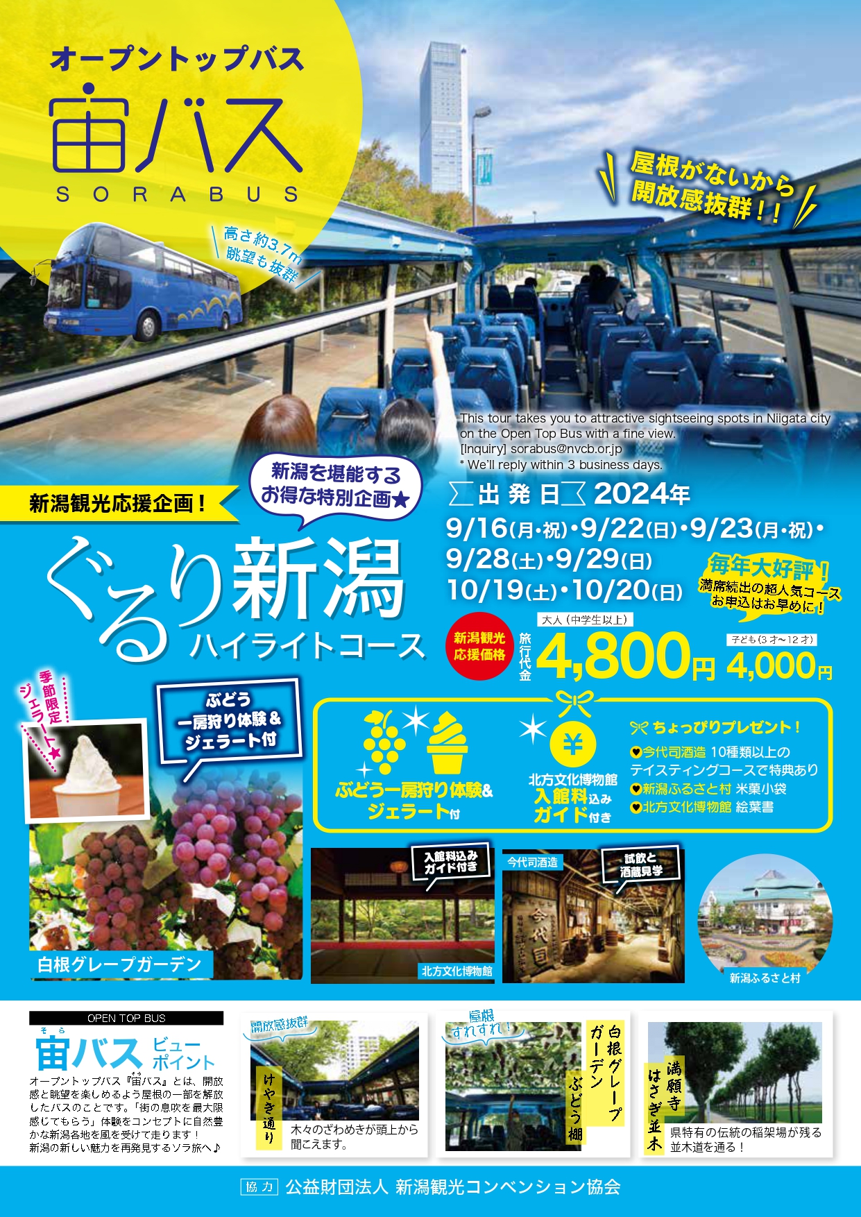 ①ホテル日航新潟(8:30)=②ホテルオークラ新潟(8:45)=③ANA クラウンプラザホテル新潟(8:55)=④新潟駅南口(9:20)=北方文化博物館(ガイド付き見学)=白根グレープガーデン(フルーツ狩り体験)=新潟ふるさと村(お買い物・自由昼食)=今代司酒造(酒蔵見学)=新潟駅南口(15:30)
